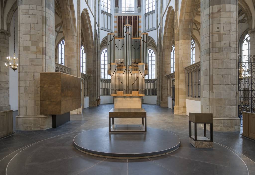 Im gotischen Willibrordi-Dom in Wesel nehmen die neuen Prinzipalstücke Kanzel, Ambo und Abendmahlstisch in Material und Farbe Bezug auf die Raumausstattung.